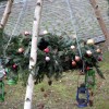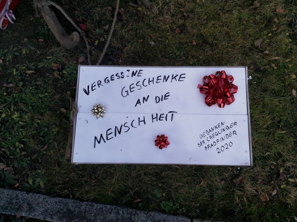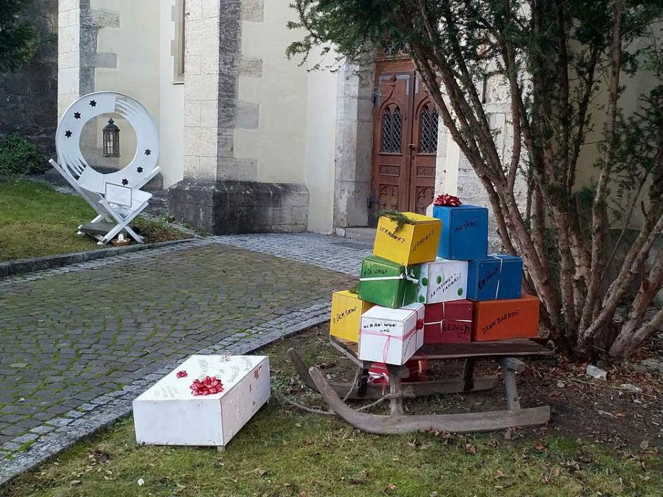Die Pfadfinder haben 2020 zu Weihnachten vor der Kirche Geschenke auf einem Schlitten aufgebaut.