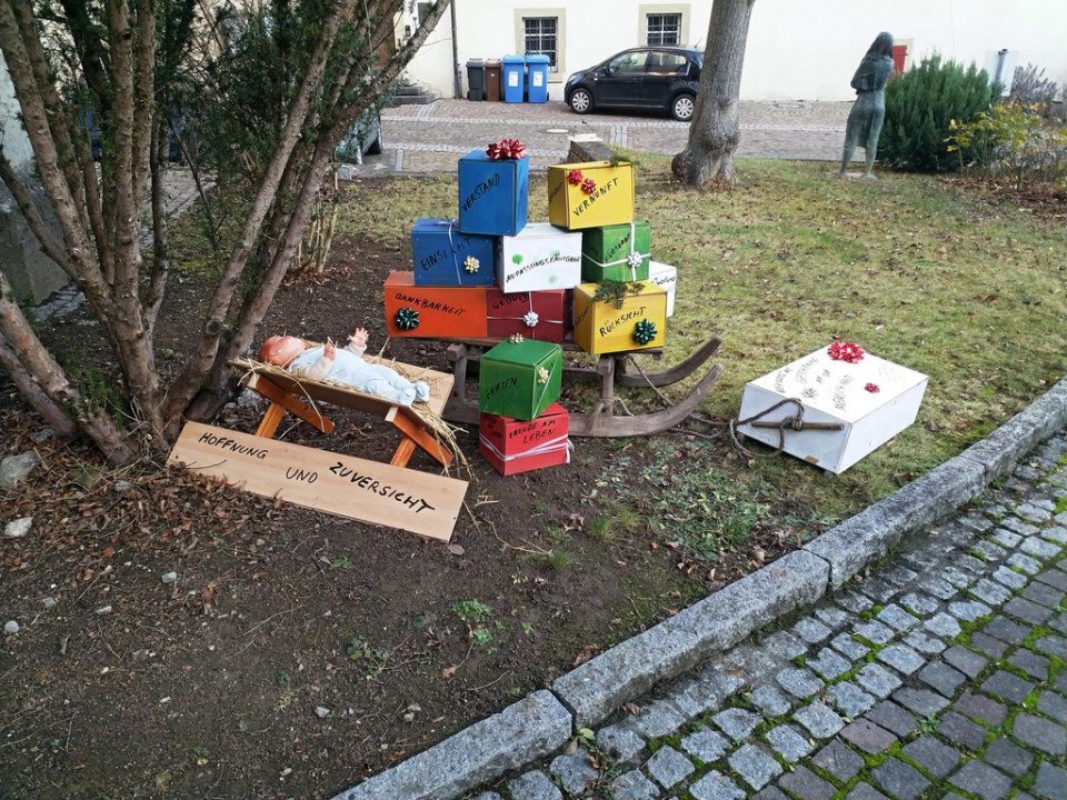 Gegenüber steht die Krippe mit dem Friedenslicht aus Bethlehem. Auf Grund der Corona-Pandemie wurde das Licht in diesem Jahr mit dem Flugzeug nach Wien geflogen. Die österreichischen Pfadfinder haben das Licht an der deutschen Grenze abgestellt und von dort wurde es von den deutschen Pfadfindern abgeholt.