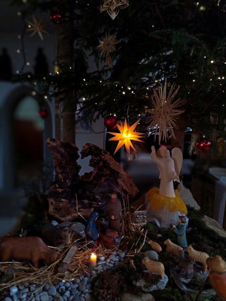 Bilder des Weihnachtsbaumes 2020 und der wunderschön gestalteten Weihnachtskrippe.
